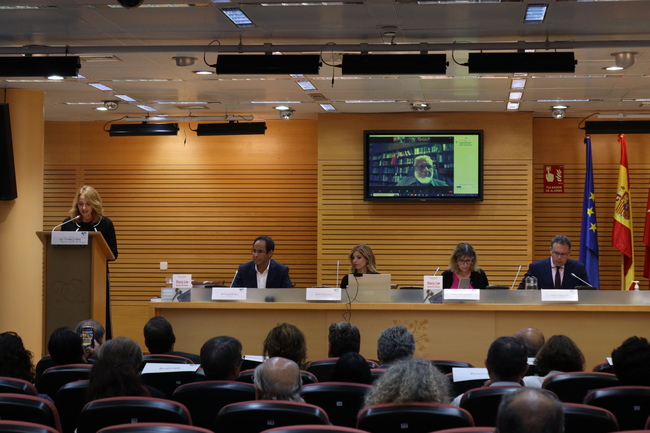 Muhammad Khalid Masud (Juez Ad Hoc de la Sala de Apelaciones de la Sharia de la Corte Suprema de Pakistán) en pantalla. Y de izquierda a derecha: Elea Giménez (directora del CCHS-CSIC); Mohammed Dahiri (profesor de Estudios Árabes e Islámicos de la UCM); Hana Jalloul (secretaria de Política Internacional y Cooperación al Desarrollo en la CEF PSOE;  Delfina Serrano (investigadora del ILC-CSIC) Y Laurent Chaminade (World Scientific Europe Ltd.), en el Salón de Actos del Centro de Ciencias Humanas y Sociales del CSIC | Fotografía: CCHS, 14/09/2022