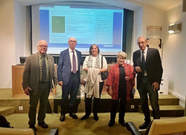 De izquierda a derecha: Petros Tsarouchis, primer consejero de Diplomacia Pública y portavoz de la embajada de Grecia en Madrid; Mariano Valverde; Helena Rodríguez Somolinos, investigadora del ILC-CSIC; Concepción Morales Otal y Emilio Crespo, presidente del Patronato de la Fundación Pastor.