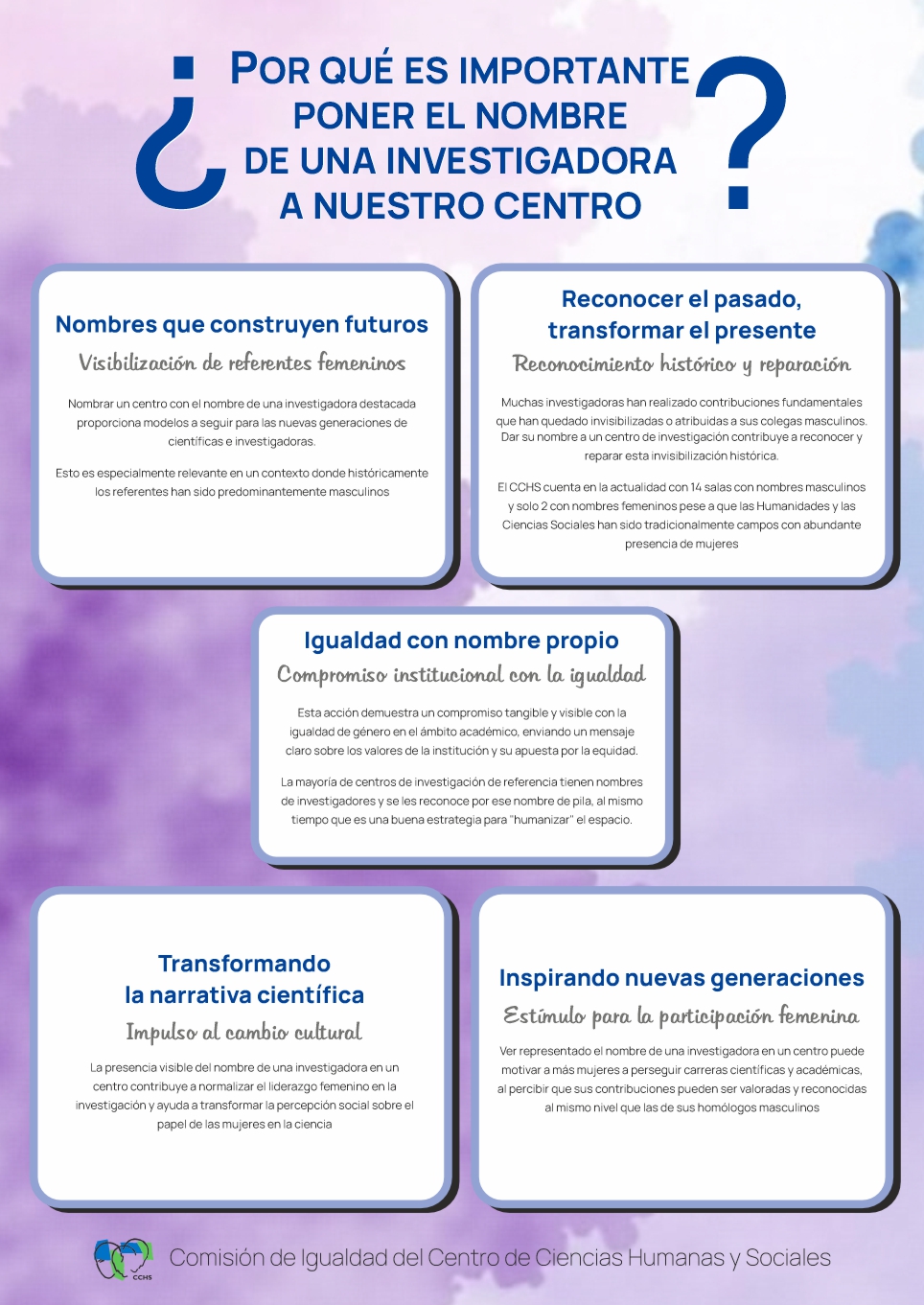 Con estas acciones la Comisión de Igualdad del CCHS quiere sumarse a las indicaciones recibidas de la Unidad de Mujeres y Ciencia, con la cooperación de la Comisión Delegada de Igualdad y la Comisión de Mujeres y Ciencia del CSIC, que insiste en su escrito difundido el pasado 2 de diciembre de 2021 en “La igualdad en los centros de investigación: Mapeo sobre actividades y necesidades de sus Comités de Igualdad”.